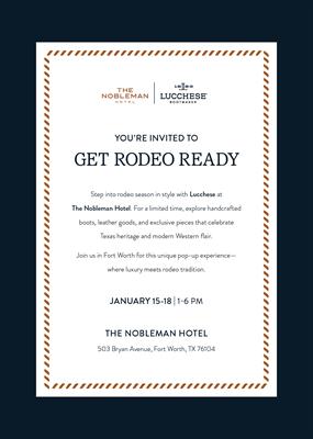 Step into rodeo season in style. Join The Nobleman Hotel and Lucchese for an exclusive pop-up featuring handcrafted boots, leather goods, and timeless Texas craftsmanship. Get a chance to taste some of our Rodeo Fort Worth inspired cocktails and light bites! January 15–18, 1–6 PM.